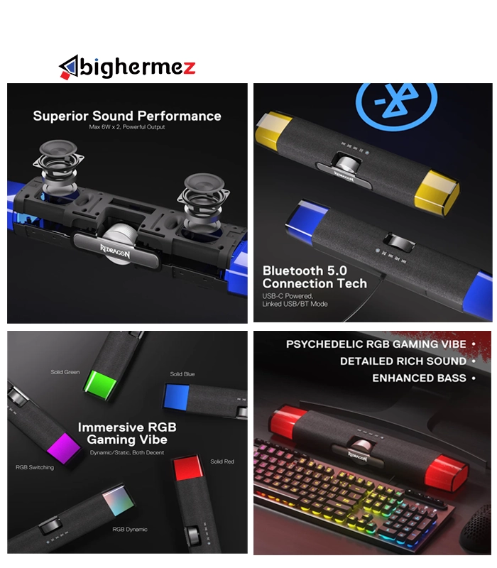 اسپیکر گیمینگ ردراگون DORA GS512 RGB با بهره‌گیری از فناوری بلوتوث 5.0 به شما امکان اتصال بی‌سیم و با کیفیت صدای بی‌نقص را می‌دهد. این اتصال بی‌سیم پایدار و بدون تأخیر، لذت شنیدن آهنگ‌های مورد علاقه‌تان را از گوشی، تبلت یا لپ‌تاپتان به حداکثر می‌رساند و تجربه‌ای بی‌وقفه و خوشایند از بازی‌ها و موسیقی را فراهم می‌کند.ین اسپیکر مجهز به واحد درایو صدای پیشرفته ۲ اینچی با هسته استریوی تقویت‌شده ۲.۰ کاناله است. که همراه با قدرت نامی ۶ وات در دو کانال، صدایی شفاف و غنی ارائه می‌دهد. این ویژگی‌ها تجربه‌ای فوق‌العاده از صدای با کیفیت بالا را برای شما به ارمغان می‌آورد.اسپیکر ردراگون DORA GS512 RGB با طراحی مینیمالیستی و بدنه‌ای محکم، دارای استایل آرام و کم‌نشان است. فرم باریک این ساندبار آن را برای هر نوع دسکتاپی در خانه مناسب می‌سازد و به راحتی در هر فضایی جای می‌گیرد.نورپردازی RGB این اسپیکر، به شکل آب‌نبات کریستالی و متقارن، همراه با پوسته شفاف سیاه‌رنگ در دو طرف اسپیکر. جوی مرموز و جذاب برای گیمینگ ایجاد می‌کند. این نورپردازی دینامیک و لطیف اما نه بیش از حد درخشان، زیبایی خاصی به محیط بازی شما می‌بخشد.با استفاده از فناوری اتصال بی‌سیم بلوتوث و اتصال USB-C، این اسپیکر قابلیت انتقال صدای پایدار را دارد. و می‌تواند با انواع دستگاه‌ها از جمله کامپیوتر، تلویزیون، لپ‌تاپ و دیگر دستگاه‌ها همگام شود. این ویژگی‌ها به اسپیکر اجازه می‌دهد تا در هر نوع محیطی به خوبی عمل کند. اسپیکر گیمینگ ردراگون DORA GS512 RGB اسپیکر گیمینگ ردراگون DORA GS512 RGB با ویژگی‌های منحصر به فرد خود مانند اتصال بی‌سیم بلوتوث 5.0، صدای باس تقویت‌شده، طراحی کامپکت و نورپردازی جذاب RGB. یک انتخاب عالی برای علاقه‌مندان به گیمینگ و کیفیت صدای بالا است. این اسپیکر با سازگاری گسترده و استفاده آسان، تجربه‌ای بی‌نظیر از شنیدن موسیقی و بازی‌های رایانه‌ای را برای شما فراهم می‌کند.