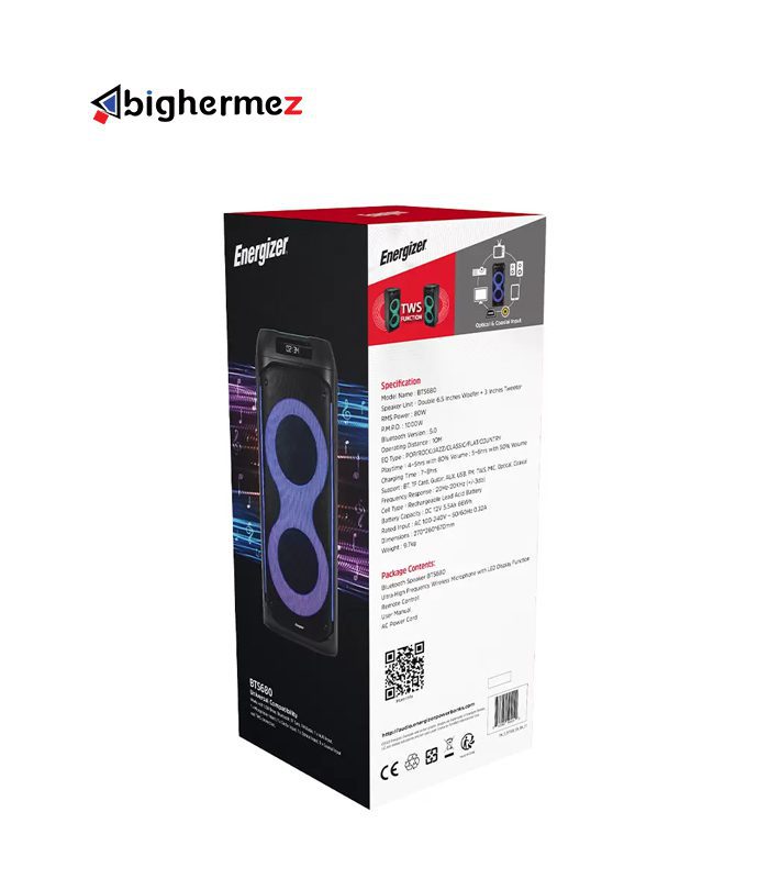 اسپیکر بلوتوث قابل حمل انرجایزر مدل BTS822 دارای طراحی مستطیل شکلی است. با رنگ مشکی و در اطراف اسپیکر LED هایی با رقص نور که به این اسپیکر جلوه خاصی میدهد. قابلیت پشتیبانی از رادیو FM، ورودی AUX، ورودی کارت حافظه،USB از قابلیتهای این محصول است.نسخه بلوتوث این اسپیکر 5.0 میباشد.