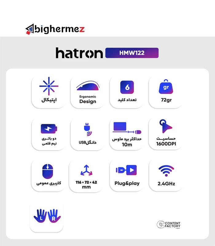 برند Hatron یکی از بهترین تولیدکنندگان موس و کیبورد و سایر لوازم جانبی در ایران است. ماوس «HMW122SL» از سری موس‌های هترون است که بی‌صدا و بسیار خوش‌ساخت است. این ماوس دارای 6 کلید بوده و نوع اتصال آن به سیستم از طریق دانگل مخصوص است. طراحی ارگونومیک زیبا و شیک این ماوس برای استفاده با دست راست طراحی شده است که از فشار بی‌مورد بر دست جلوگیری می‌کند و به‌راحتی در دست قرار می‌گیرد. ماوس HMW122SL دارای کلید DPI Switch بوده و در سه سرعت 1200،800 و 1600 قابل‌تنظیم است. وجود کلید های Back و Forward روی موس سبب راحتی و سرعت عمل در کار با سیستم عامل و ویگردی می شود. فرکانس این ماوس برابر 2٫4 گیگاهرتز است و تا 20 متر مسافت را پشتیبانی می‌کند. به‌این‌ترتیب برای کنترل سیستم کامپیوتری خود، محدود به میز کار نبوده و به‌راحتی از فاصله دور هم قادر به انجام کارهای کامپیوتری خود هستید. انرژی موردنیاز این ماوس از طریق یک عدد باتری‌قلمی(سایزAA) تامین می‌شود. ویژگی بارز این مدل قابلیت Auto Power است که سبب صرفه جویی در مصرف باتری و طول عمر آن می شود. این ماوس با تمامی سیستم‌عامل‌های رایج سازگاری دارد. طراحی آن مینیمال و ساده، برای سیستم‌های خانگی، اداری و بانک‌ها انتخاب مناسبی به‌ شمار می‌آید و توانسته در بین کاربران سیستم‌های کامپیوتری توجه بسیاری از افراد را جلب کند. این ماوس دارای رنگ‌بندی بوده و در رنگ های مشکی، آبی و قرمز تولید و به بازار عرضه می‌شود.