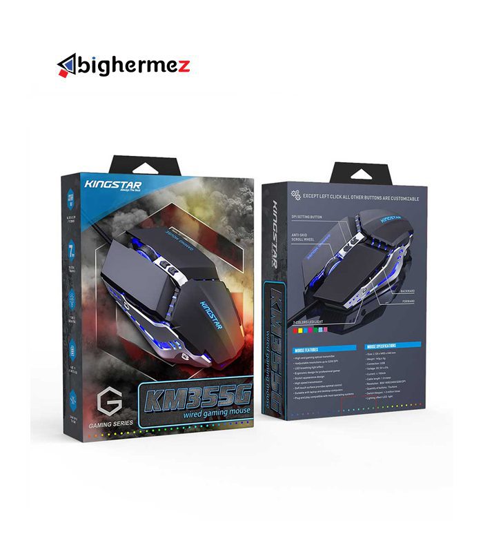 ماوس مخصوص بازی کینگ استار مدل KM355G  از طریق کابل و پورت USB به کامپیوتر متصل می‌شود. طول کابل این ماوس برابر 1.8 متر و جنس رویه کابل از کنف میباشد.طراحی ارگونومیکی ماوس گیمینگ KM355G باعث میشود. کاربر پس از استفاده مداوم احساس خستگی نکند. ضربه‌پذیری کلیدهای این محصول برابر 3 میلیون بار است. یکی از مهم‌ترین مشخصات ماوس‌های مخصوص بازی برند کینگ استار مدل KM355G رزولوشن قابل تنظیم تا 3200 DPI آن است.