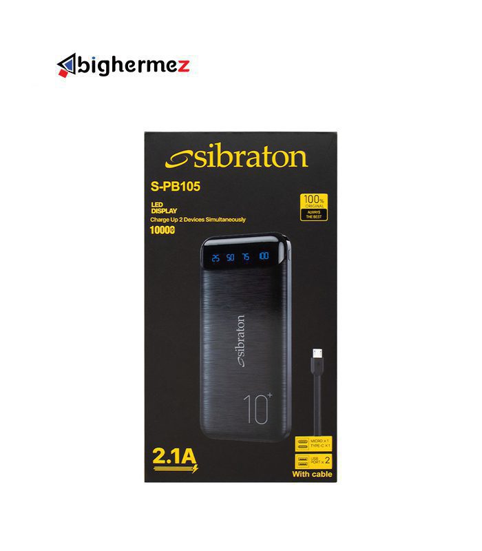 • پاوربانک S-PB105 دارای 4 پورت می‌باشد که شامل 2 پورت ورودی micro-usb و تایپ سی و 2 پورت خروجی USB می‌باشد. مقدار ورودی و خروجی این کالا عبارتند از: Input: DC5V-2.1A//Output: DC5V-2.1A پاوربانک 10000mAh سیبراتون مدل S-PB105 دارای نشانگر LED جهت نمایش میزان شارژ است و بدنه آن از پلاستیک مقاوم ABS ساخته شده که مهمترین ویژگی آن عدم اشتعال کالاست. همچنین این محصول دارای وزن 235 گرم می‌باشد که در کلاس وزنی پاوربانک‌های سبک قرار دارد. ابعاد این شارژر همراه 141.5x67x15 میلی‌متر است.این پاوربانک با ظرفیت اسمی 10000 میلی آمپر دارای باتری لیتیوم پلیمر نیز می‌باشد. از اقلام همراه این کالا نیز می‌توان به دفترچه‌ی راهنما به همراه یک کابل micro-USB اشاره کرد. همچنین قابلیت شارژ تلفن‌های هوشمند، دوربین‌های دیجیتال و آی‌پد را نیز داراست.