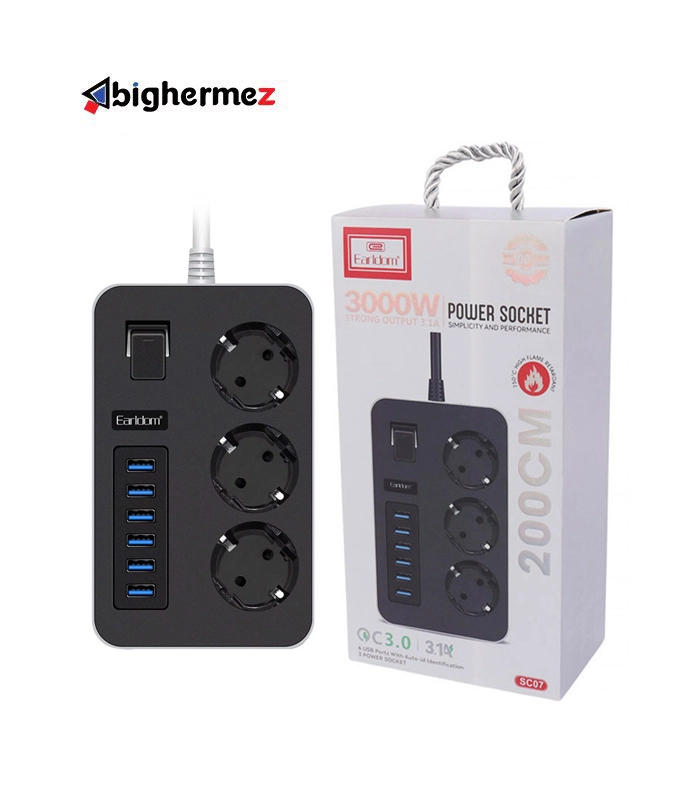 چند راهی 3 خانه برق ارلدام ES-SC07 با کابل 2 متری + شارژر USB